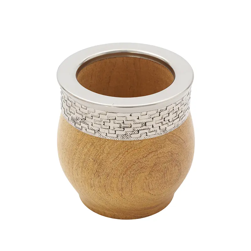 Mate de algarrobo seleccionado pulido con virola imperial de acero inoxidable guarda pampa. Cada pieza puede presentar vetas y nudos que le otorgan un carácter único. Es ideal para quienes desean un mate resistente, elegante y cómodo para el uso diario o para regalar. Capacidad: 60 a 75gr de yerba. Dimensiones: - Diámetro exterior de boca 9 cm, interior 6,3 cm. - Altura entre 9,5 y 9,8 cm. - Peso entre 295 y 315 g. Pampa Spirit